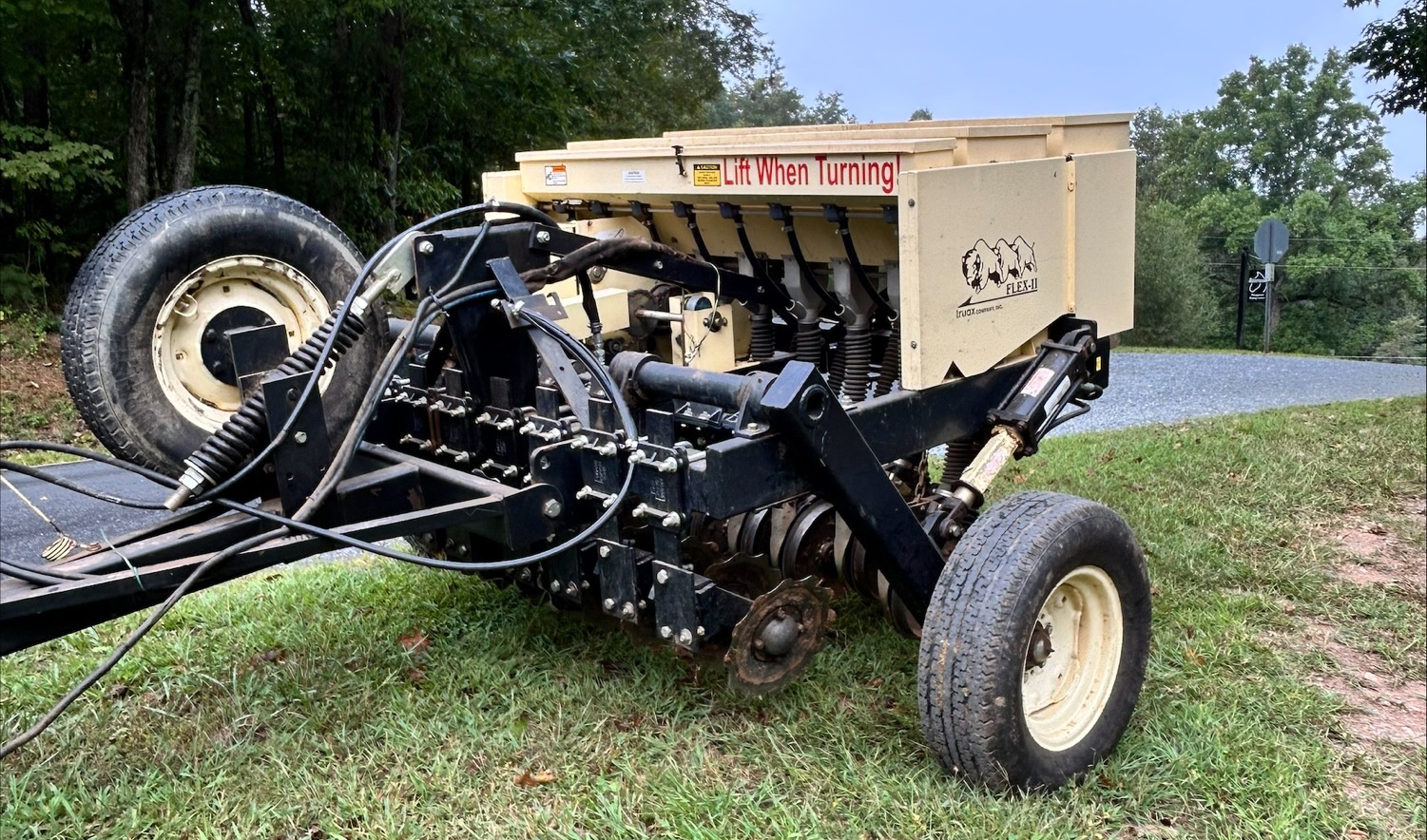 The drill is a Truax Flex II 88 end wheel model, and requires at least a 40- horsepower tractor with hydraulic capacity. Seeding width is 5.3 feet and transport width is 9 feet. The drill weighs 3,000lbs. and can be towed by a pickup truck.